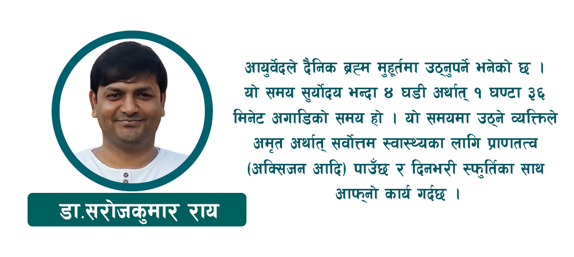आयुर्वेदले दैनिक ब्रह्म मुहूर्तमा उठ्नुपर्ने भनेको छ । यो समय सुर्योदय भन्दा ४ घडी अर्थात् १ घण्टा ३६ मिनेट अगाडिको समय हो । यो समयमा उठ्ने व्यक्तिले अमृत अर्थात् सर्वोत्तम स्वास्थ्यका लागि प्राणतत्व (अक्सिजन आदि) पाउँछ र दिनभरी स्फुर्तिका साथ आफ्नो कार्य गर्दछ । ज्ञानी ऋषि मुनिहरु यही समयलाई जप–तप र योगका साधनाका लागि उपयोग गर्छन् ।